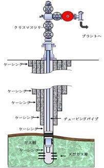 掘削が終了し噴出テスト(試ガス)で生産に移行できるガス量が確認されれば、チュービングパイプ(生産用鋼管)をセットし、地上には安全のためのバルブを幾段にも重ねたクリスマスツリーと呼ばれる装置(安全装置)が取り付けられます。石油や天然ガスは、チュービングパイプの中を通って、地上に上がってきます。