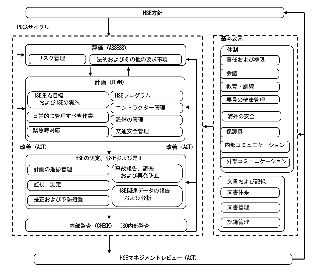事業活動に伴う労働衛生・安全・環境の問題に対し、企業のトップが定めたHSE(HSE Policy)に基づき、必要な組織・責務・実施要領・手順・計画等を定め、継続的に実行・改善していく仕組み・取組みを体系化したものです。