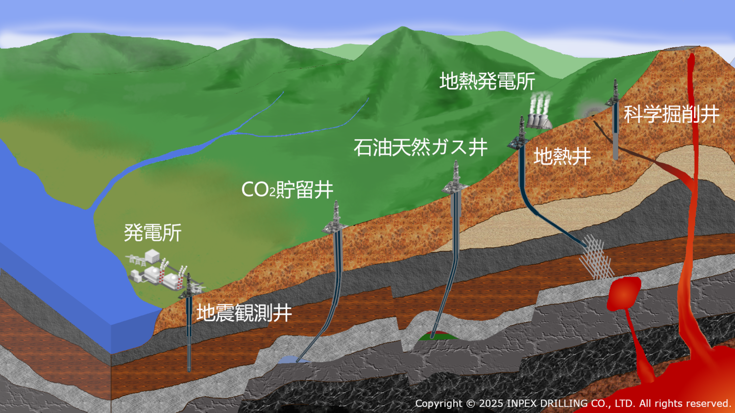 当社では、石油開発井、地熱開発井、天然ガス地下貯蔵井、深部地震観測井、二酸化炭素地中貯留実証試験井、科学掘削井、石油実験井などの掘削を行っております。また、坑井にかかわる技術開発として、地震計多段設置工法や坑井封鎖技術開発を行っております。